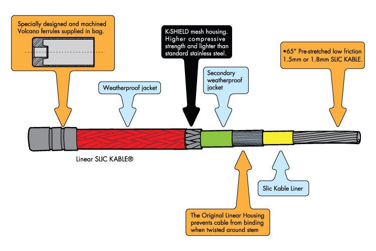This is the original BMX linear cable. Launched in 2003. Our proven Slic Kable wire is surrounded by a compression-less housing to prevent the cable from binding when the cable is twisted around during barspin or tailwhip tricks. Special volcano end ferrules to prevent housing blowout have been included since 2008. Ideal for rear brakes.